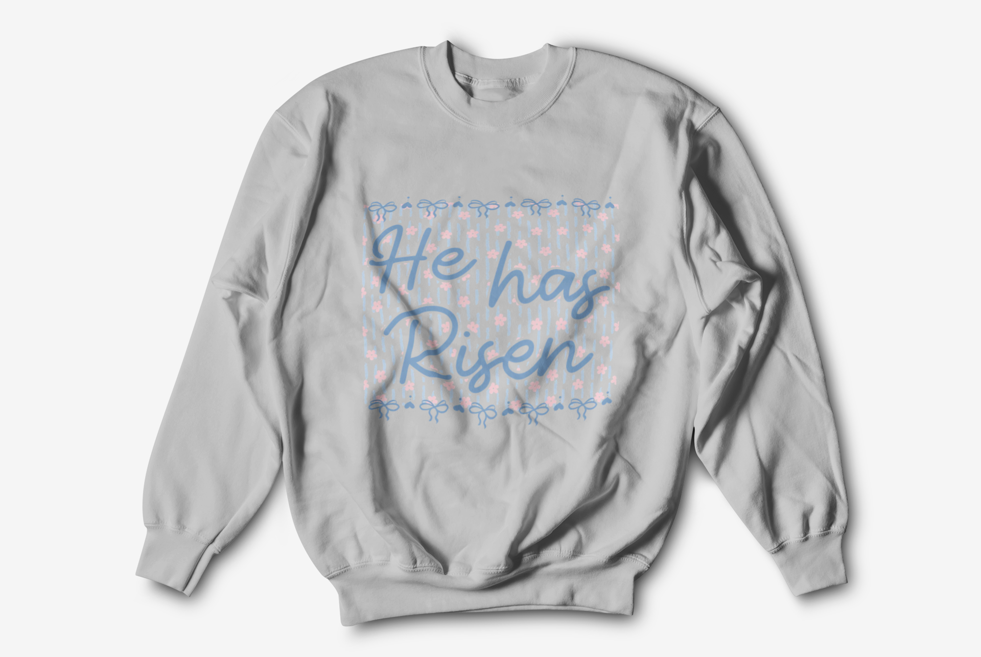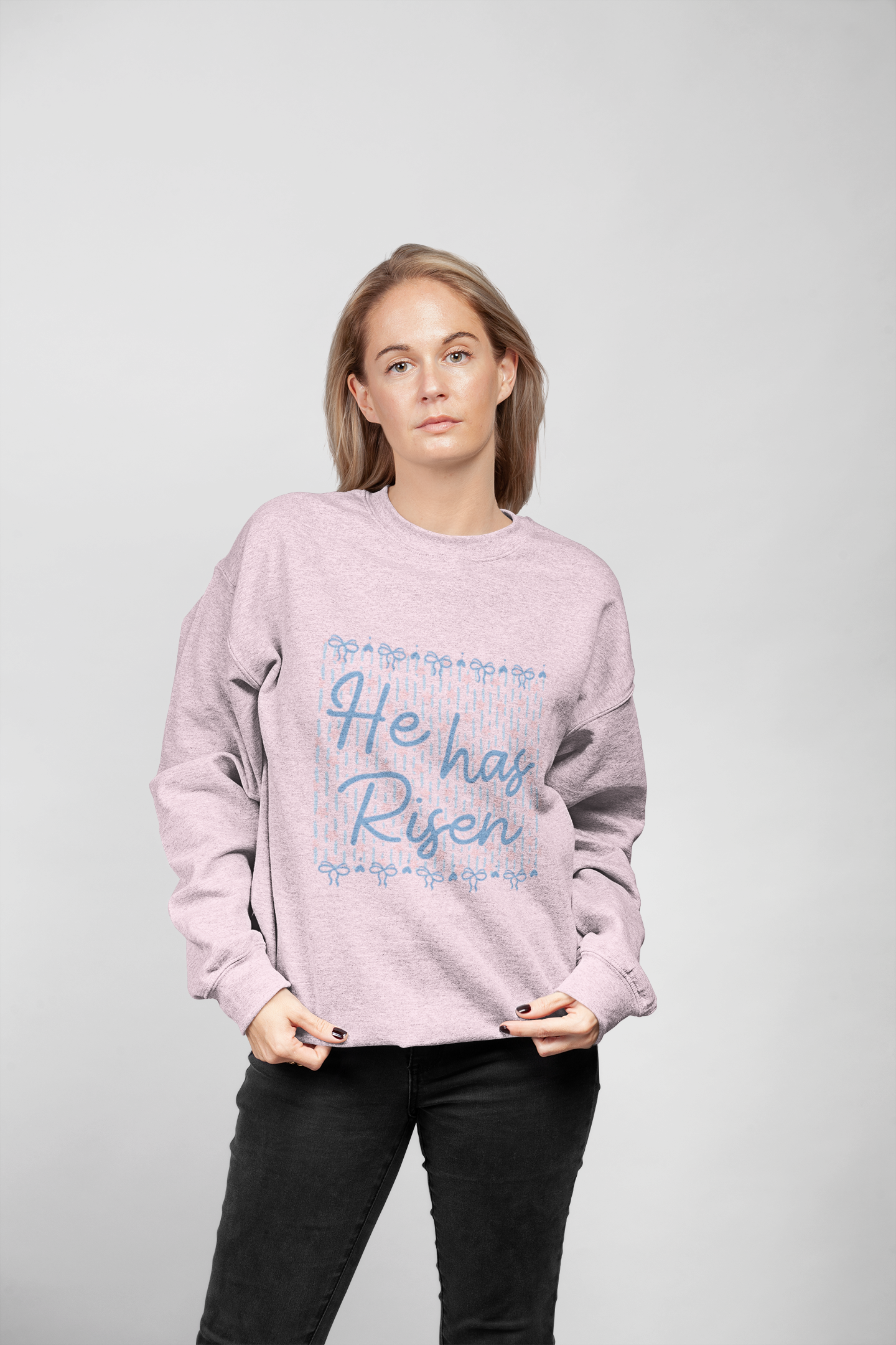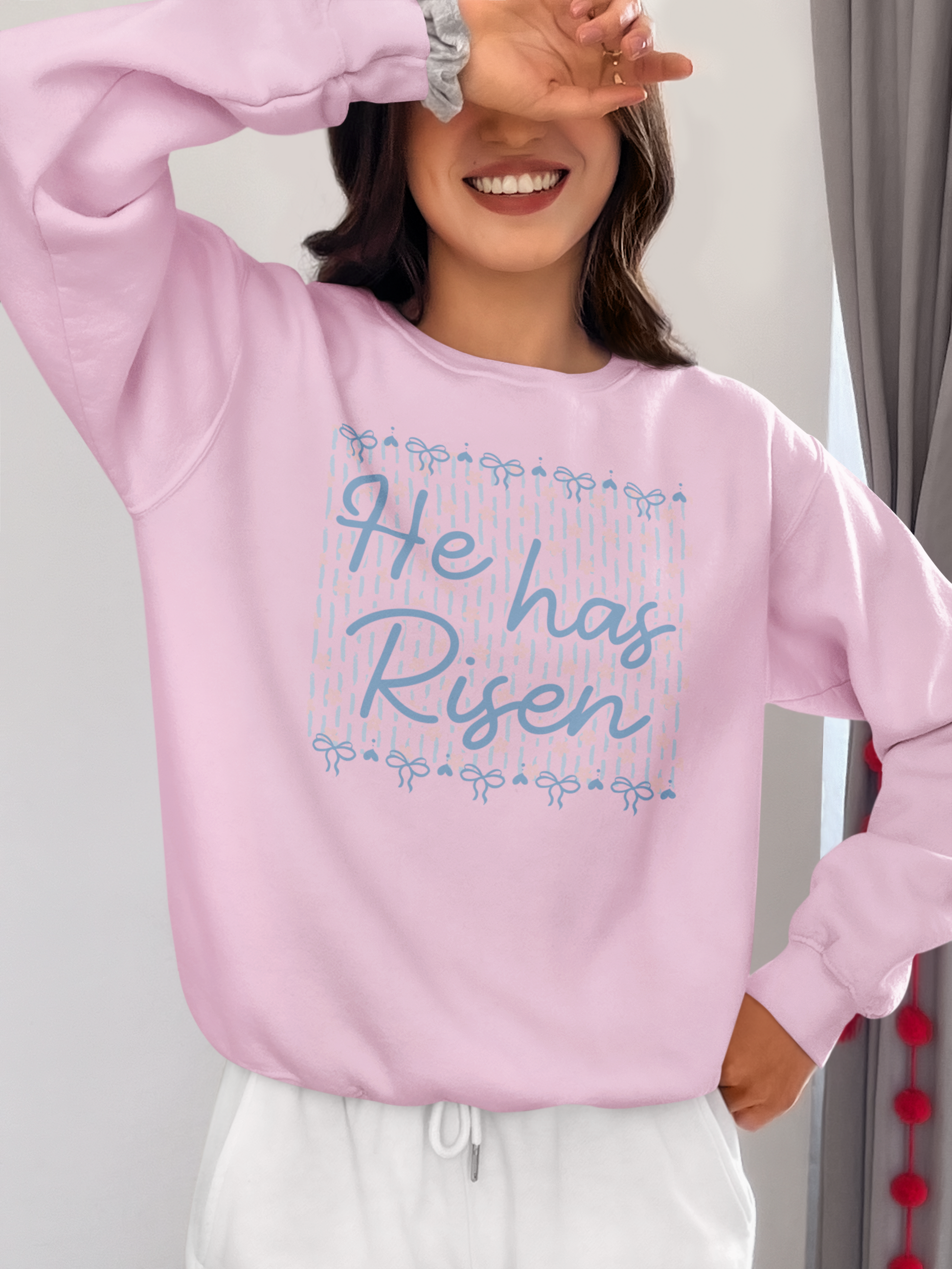 A sweet, faith-forward sweatshirt with soft pink bow details—perfect for celebrating the reason for it all 🤍